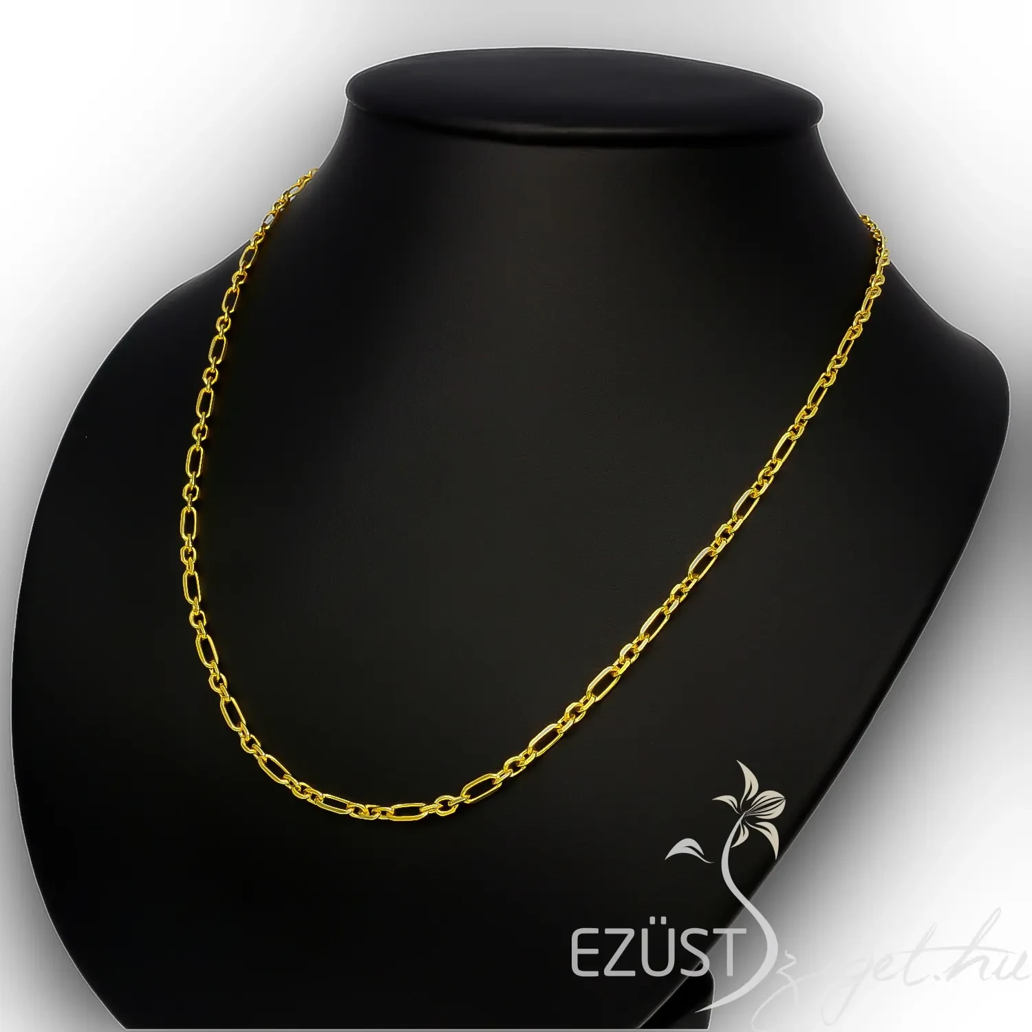 Ez a nyaklánc a Figaro típusú láncszemzésből ihletődik, ám azt egy kissé mégis átfogalmazza: a hosszú és három rövid szem beosztása megmaradt, ám egymáshoz képest mindig 90 fokban elfordítva illeszkednek a szomszédos láncszemek. A nyaklánc tökéletesen megállja a helyét önállóan, ám mindezen túl alkalmas medálok felfűzésére is, vagy akár kombinálni lehet több lánccal, alkalmazva a halmozás módszerét, így hódolni a mai divatnak. Ezek a Figaro típusú láncok régóta közkedvelt darabjai a divatnak, mivel sokféleképpen variálhatóak medálokkal és egyéb láncok kiegészítőjeként is, ezen felül egy rendkívül közkedvelt tervezésű fazon. Kialakításából adódóan egyaránt ajánljuk nőknek és férfiaknak egyaránt. Ideális ajándékba ballagásra, keresztelőre egy szép medállal, évfordulóra: biztosan nem okoz csalódást.