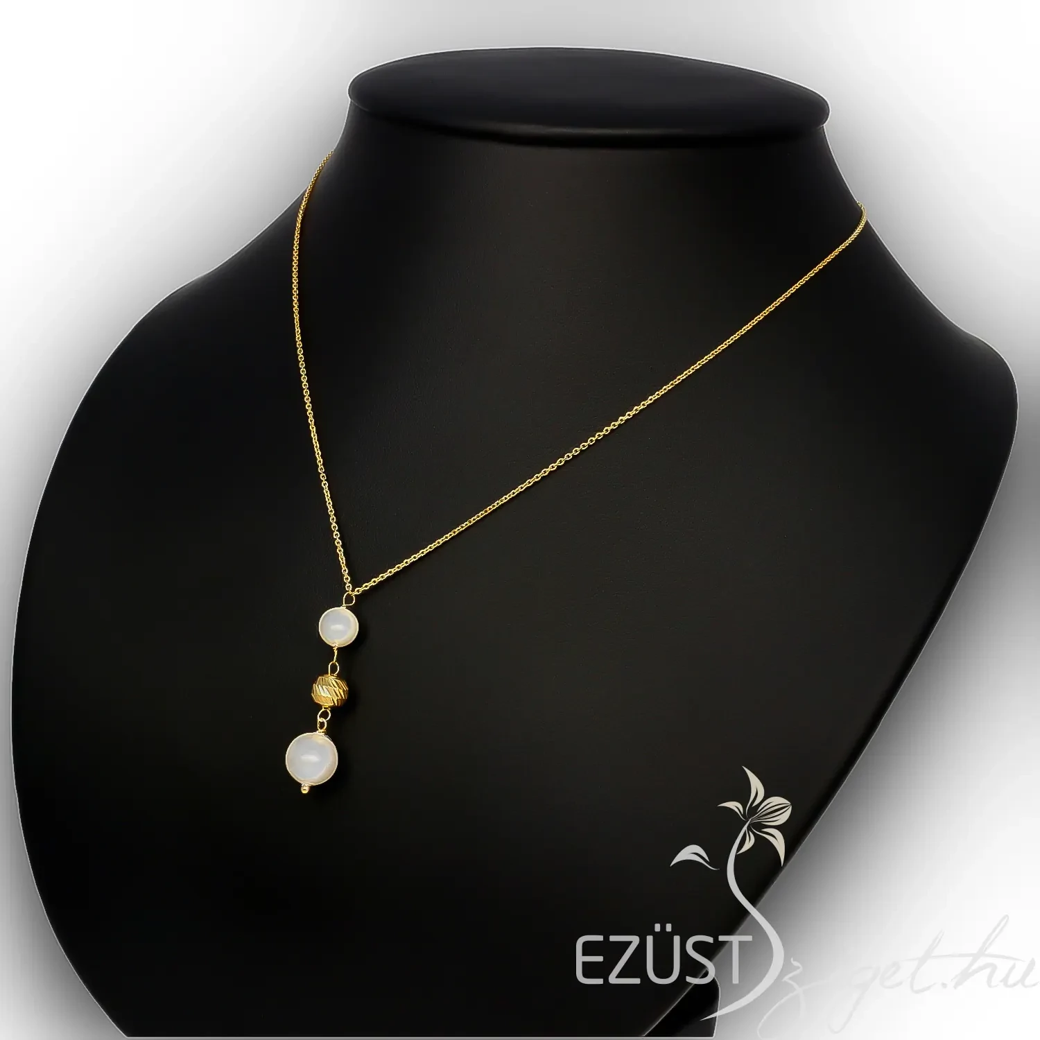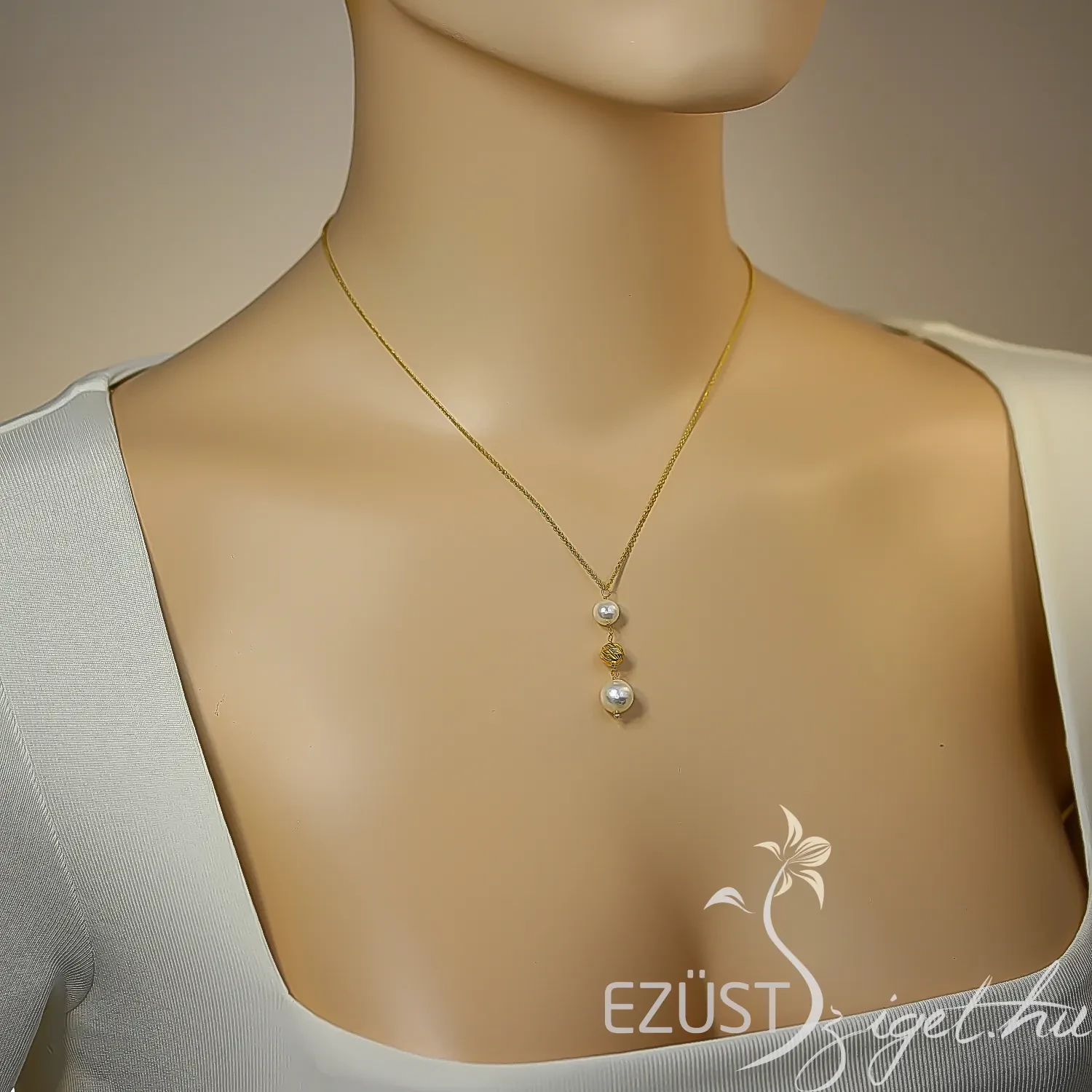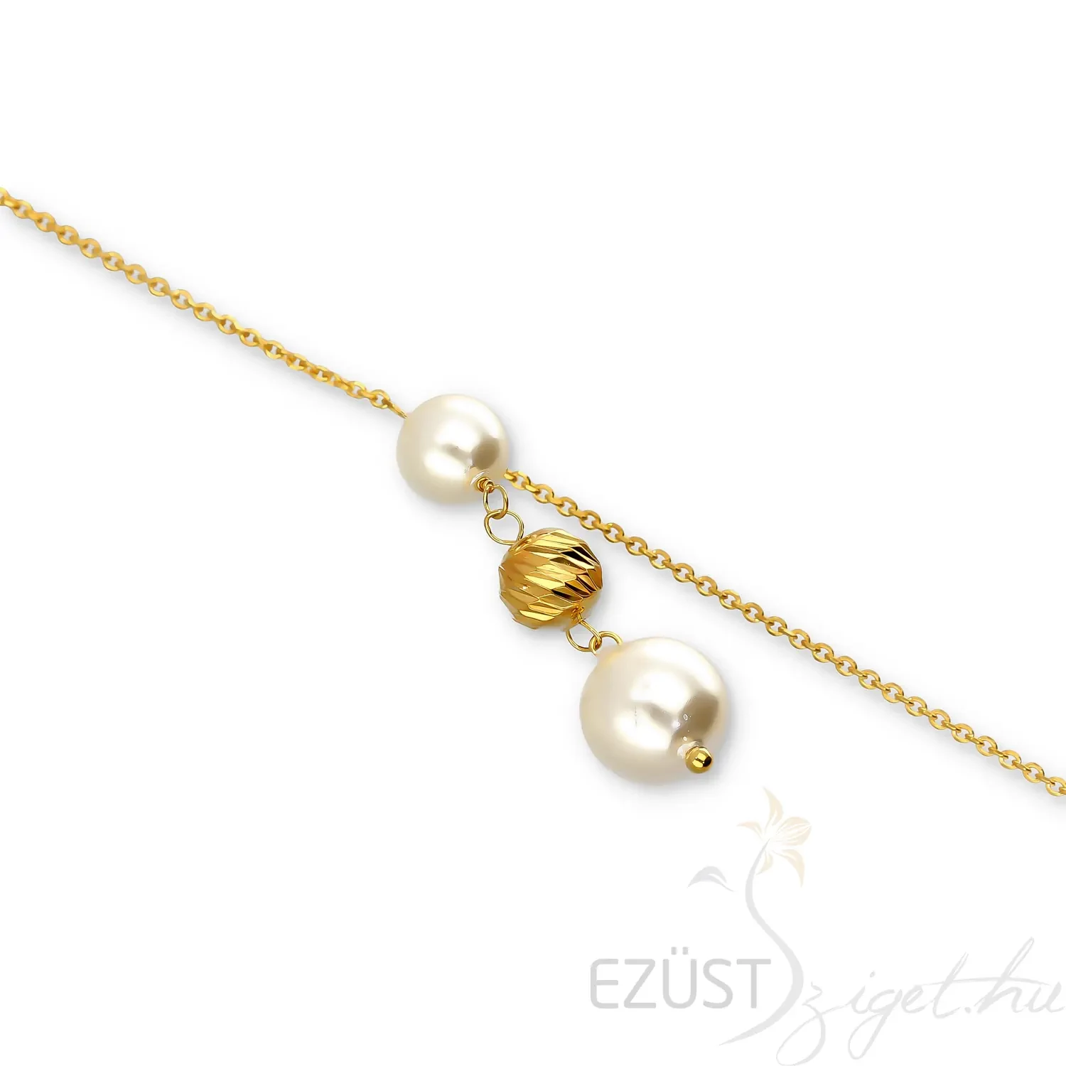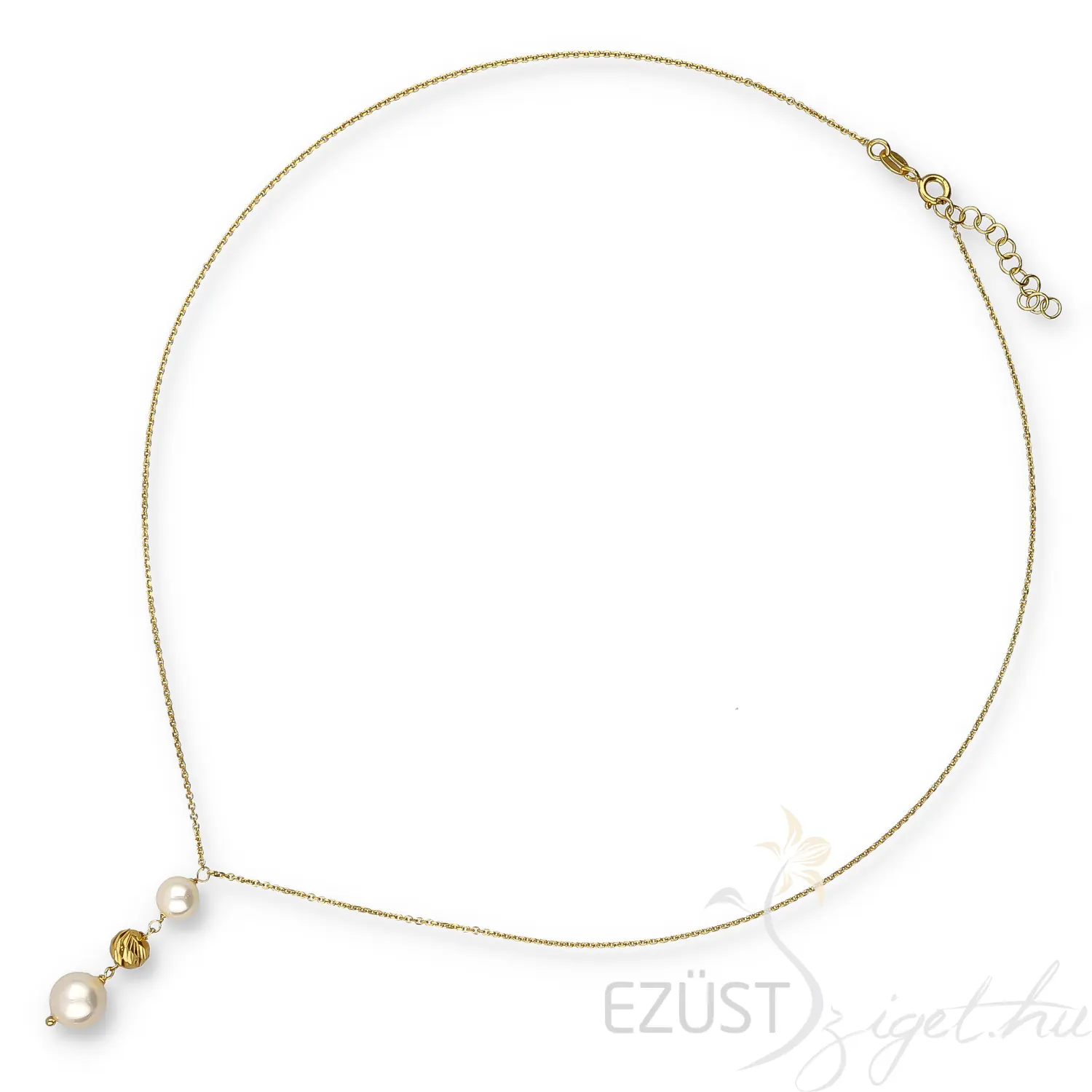 Az ékszer fő dísze egy lógós rész, melyen selyemfényű gyöngyök sorakoznak. A két kis mértékben különböző méretű gyöngyöt egy ezüst gyöngy választja el egymástól. Viseld ezt a könnyed eleganciát sugározó, klasszikus stílusban tervezett láncot, és légy divatos a mindennapokban vagy különleges eseményeken!