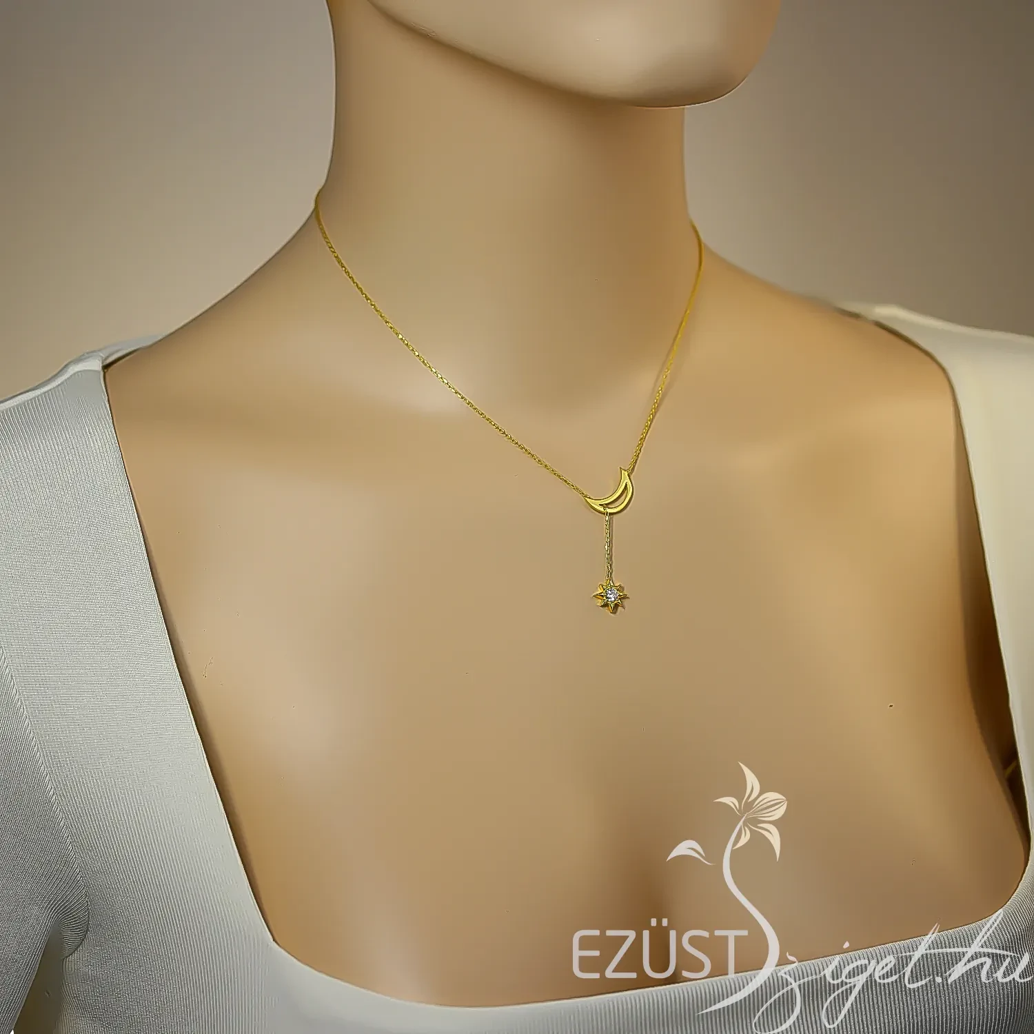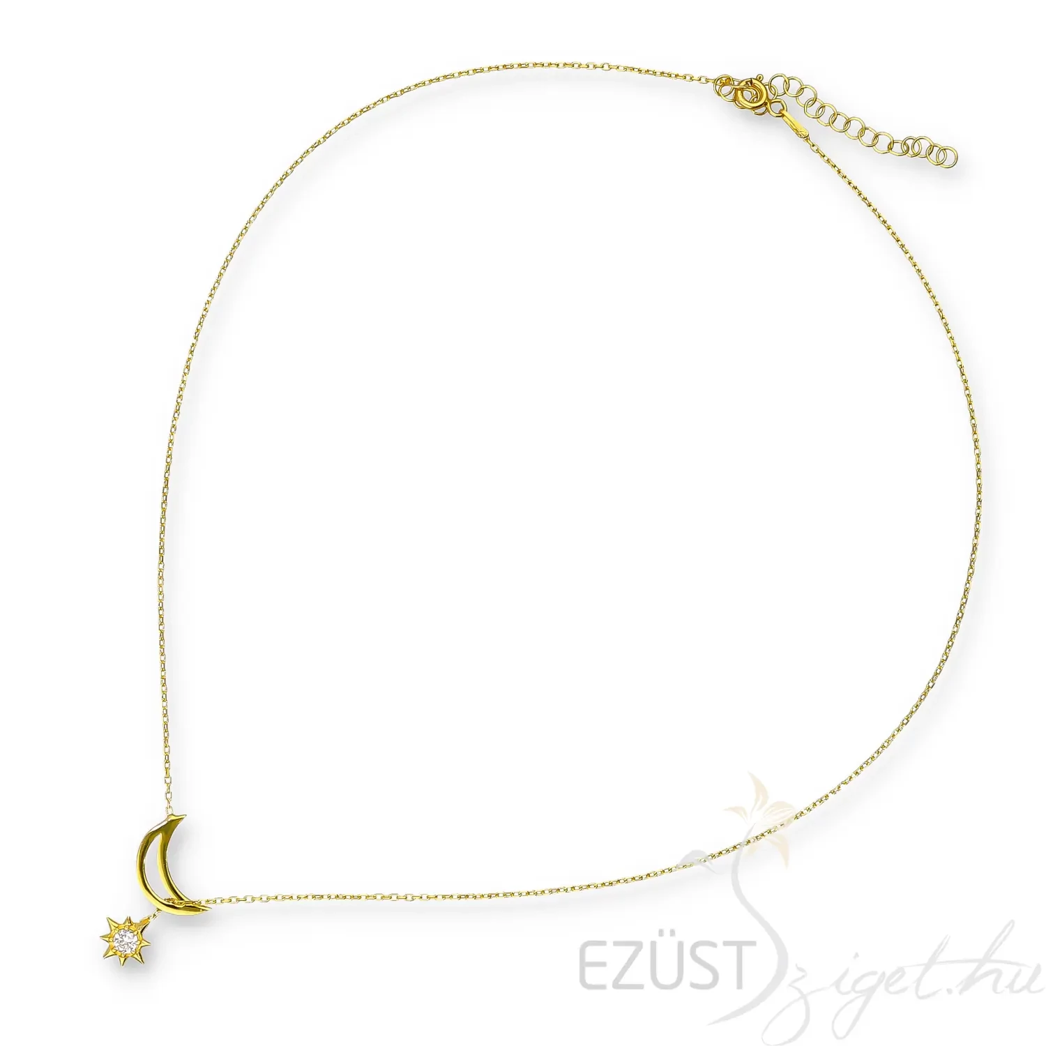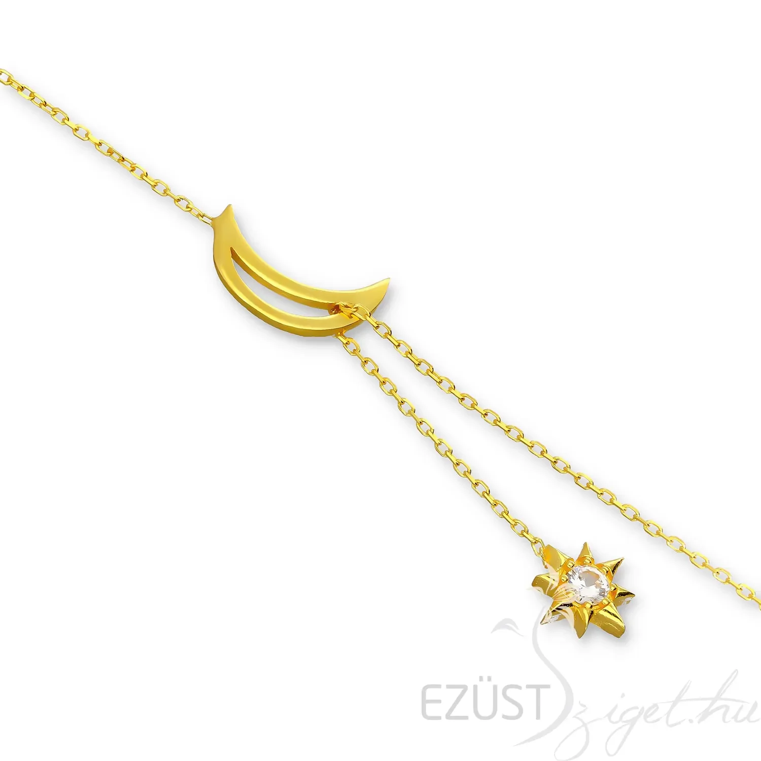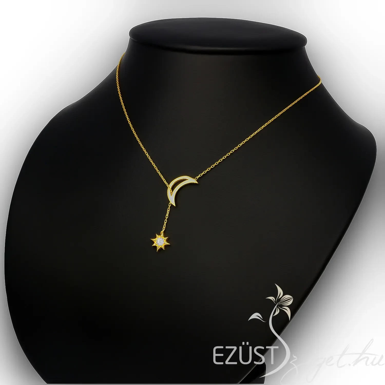 A nyakék különlegessége abban áll, hogy a hold medálon keresztülfut a lánc, melynek végén egy gyönyörűen kidolgozott, víztiszta cirkóniakővel ékesített csillag jelenik meg. A lánc így többféle stílusban is viselhető és játékosság van ebben a kivitelezési módban. Ajánljuk hölgyeknek és lányoknak egyaránt különleges alkalmakra tökéletes kiegészítő lehet.