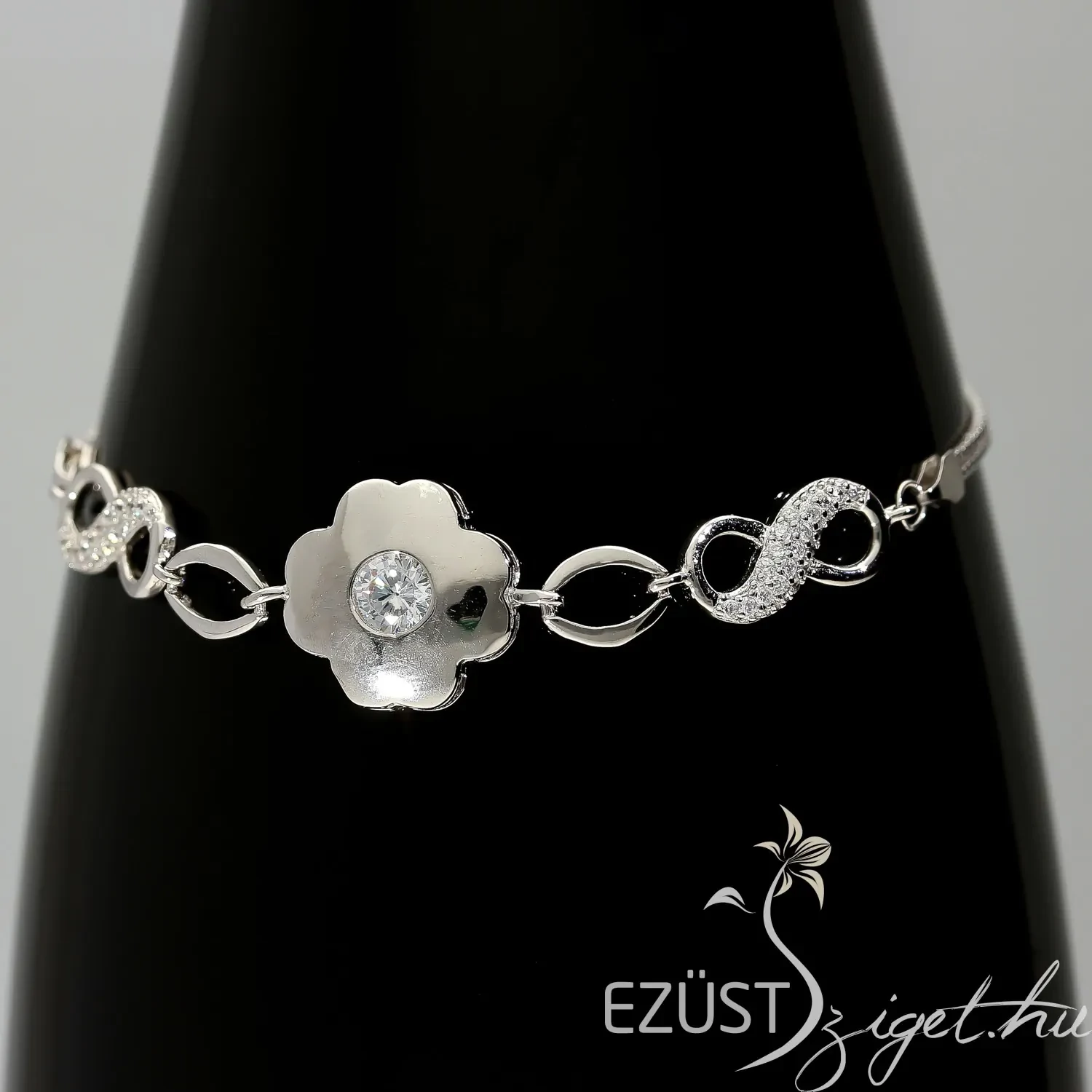 Az ékszer központi dísze egy letisztult négyszirmú virág, melynek közepén egy csodálatosan csillogó víztiszta kő látható. Egyszerű, ám szép virág motívum, mely jelképezi a megújulást, tavaszt, életet. Kiváló kiegészítő üde, friss, fiatalos, lendületes lányoknak, hölgyeknek.