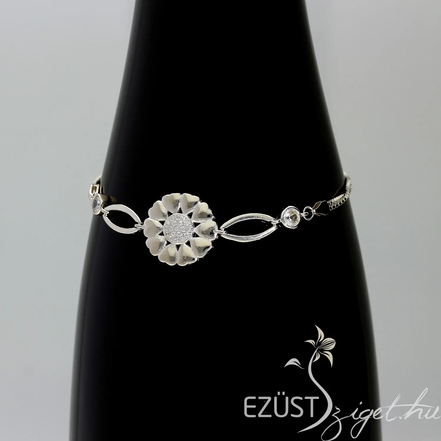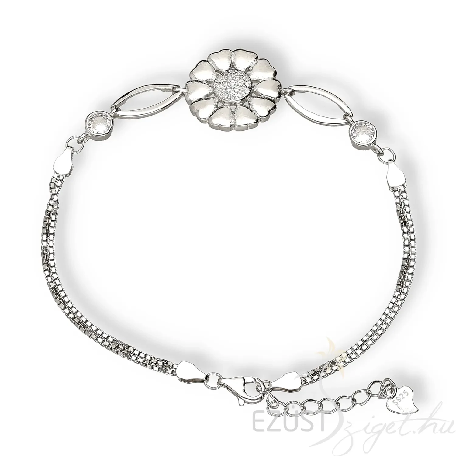 Az ékszer központi dísze a szikrázóan csillogó virág motívum, melynek minden egyes szirma egy kis szív forma, középen pedig csodálatos víztiszta cirkóniakövek találhatóak. Az ékszer lánc része dupla, nem csak esztétikai, de terhelési szempontból is fontos, mivel a központi dísz komolyabb súlyt képvisel.